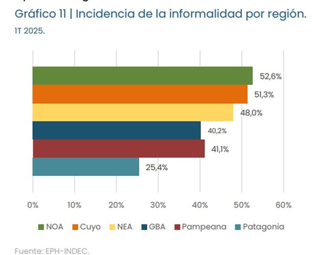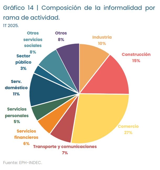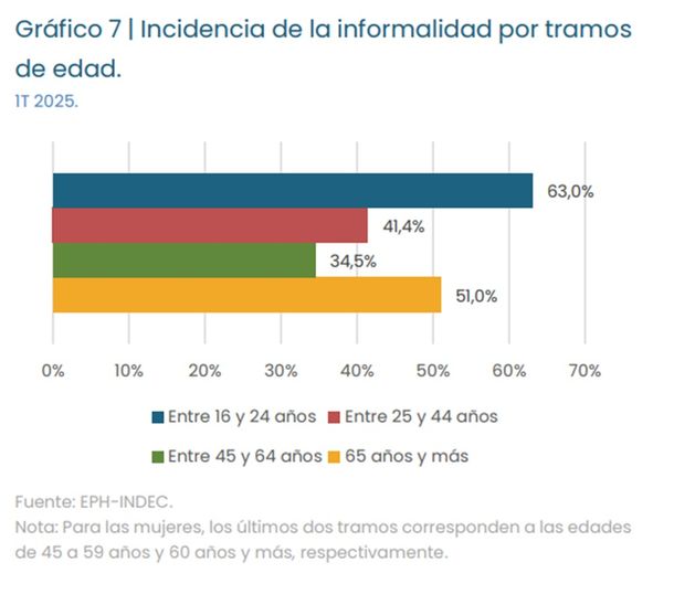 El informe advierte además que los jóvenes experimentan una tasa de informalidad significativamente más elevada que otros grupos etarios, (63%, casi 21 puntos porcentuales más elevada que la tasa global). Es decir, 6 de cada 10 trabajadores con edades entre los 16 y los 24 años son informales. Esta elevada proporción es una de las variadas manifestaciones de las dificultades que este grupo etario experimenta en el mercado de trabajo argentino.
