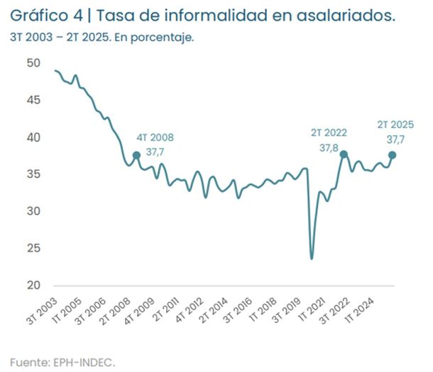El Informe destaca además que “la mirada de largo plazo (desde 2003) ubica a la tasa de informalidad asalariada en un valor idéntico al observado en el cuarto trimestre de 2008. Asimismo, es el valor más alto desde ese momento (o sea, de los últimos 17 años), con la única excepción del segundo trimestre de 2022. Por lo tanto, más allá de las fluctuaciones (y excluyendo el período de la pandemia), la tasa de informalidad asalariada se ha mantenido en valores muy elevados desde hace 17 años”.